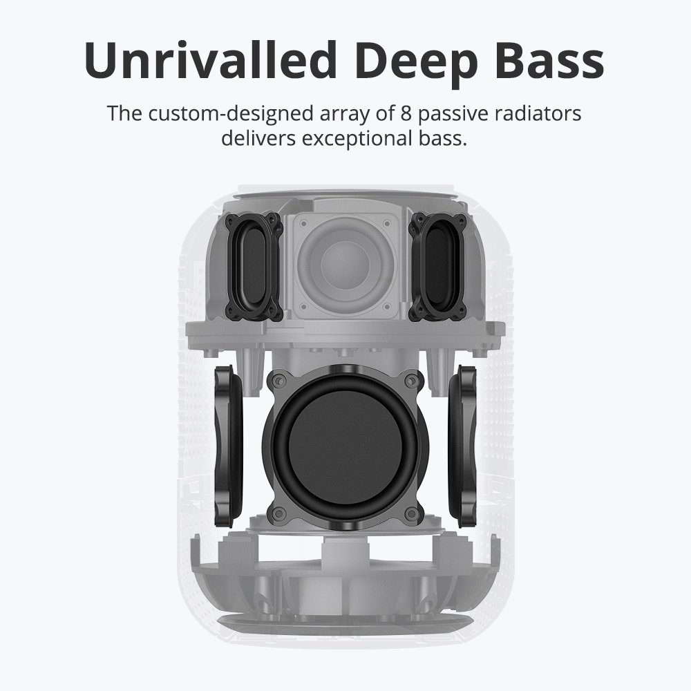 A custom-designed array of 8 passive radiators delivers monstrous sound along with the hardest hitting bass that you will not only hear but also feel it; even in a low level of volume.
